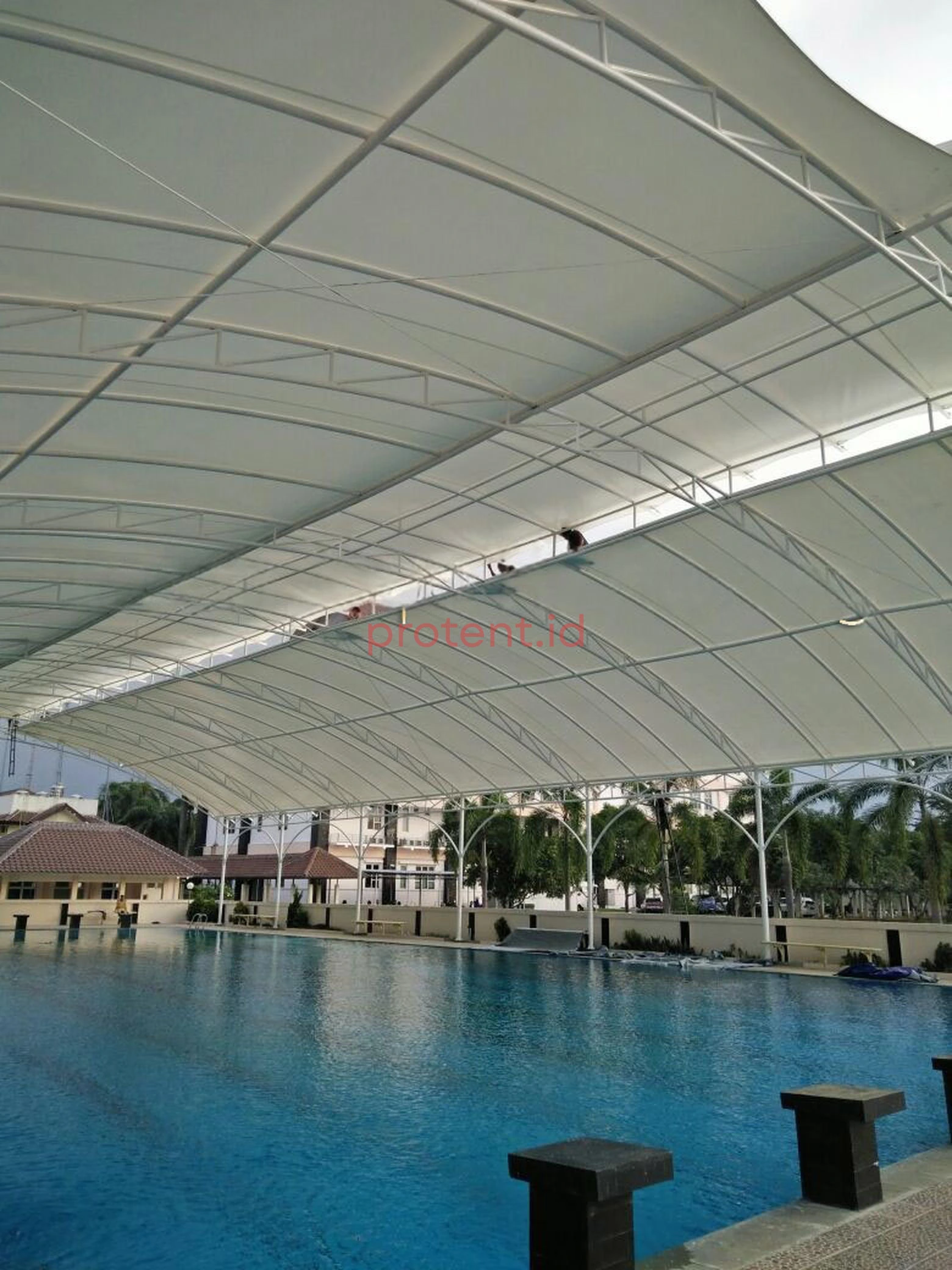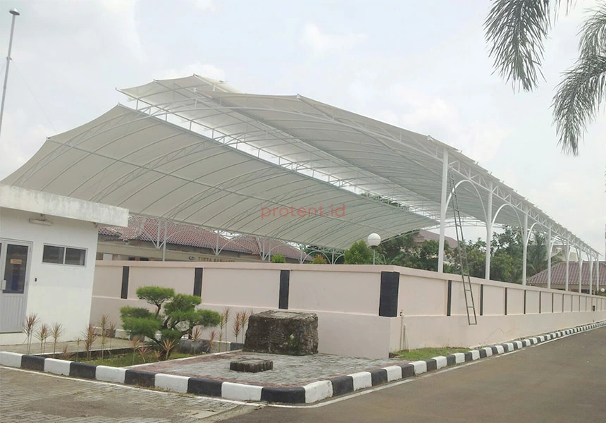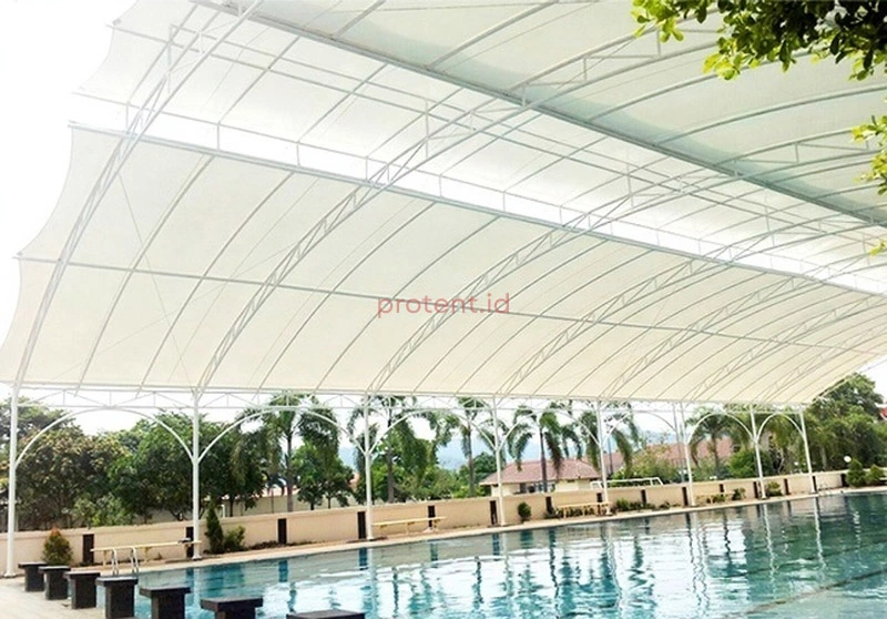 Dengan bentuk desain yang dinamis dan material membrane yang fleksibel serta tahan lama, atap ini menjadi solusi ideal untuk area publik seperti kolam renang, taman bermain, dan ruang terbuka lainnya.